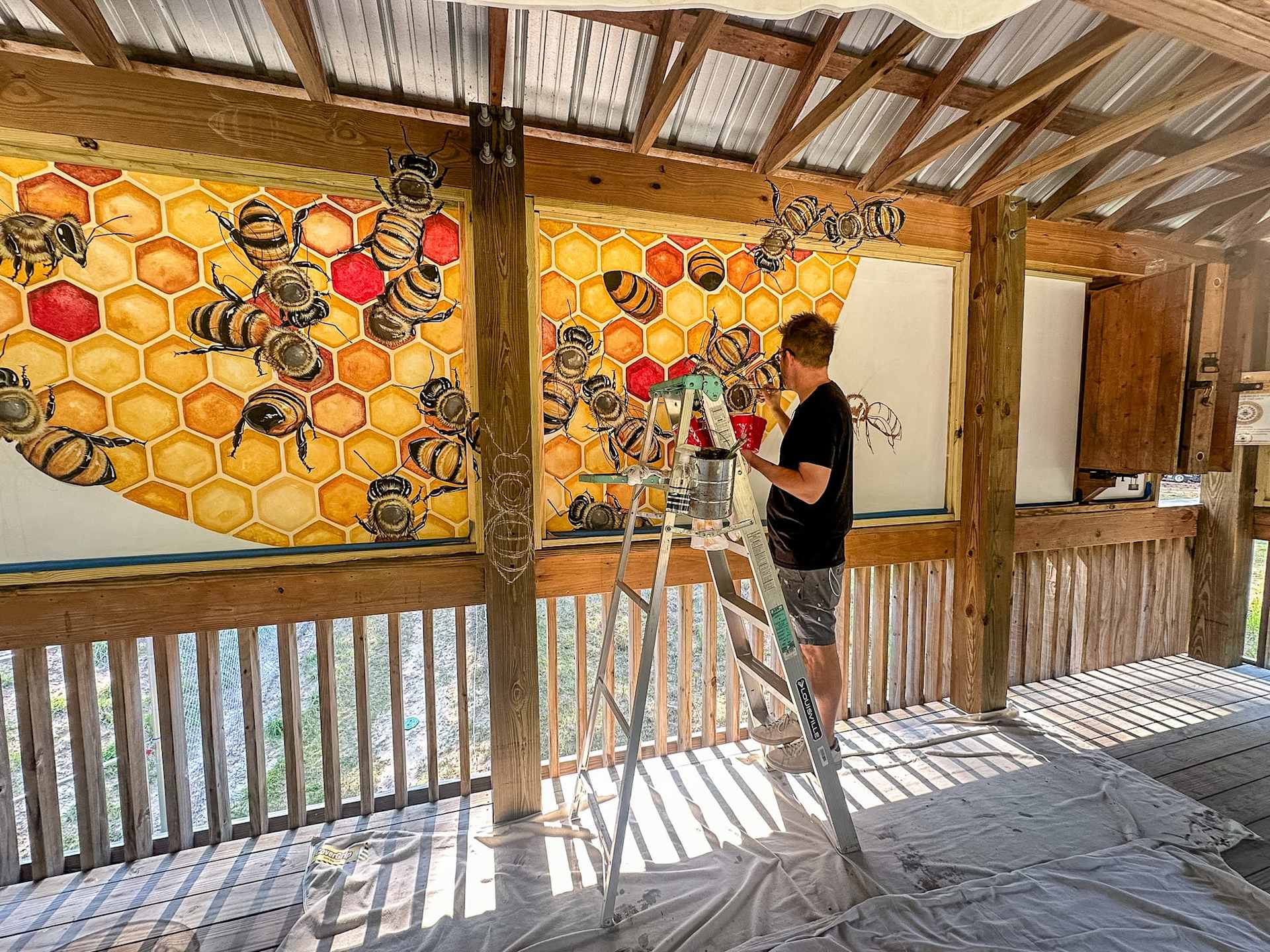 The mural, set against the backdrop of Red Wolf Ridge and a bustling beehive, celebrates the vital role of pollinators like honeybees. With every stroke of his brush, Willey brings to life the intricate beauty of these creatures and the ecosystems they support. It's a sight to behold and a testament to the magic of art in raising awareness about environmental issues.
